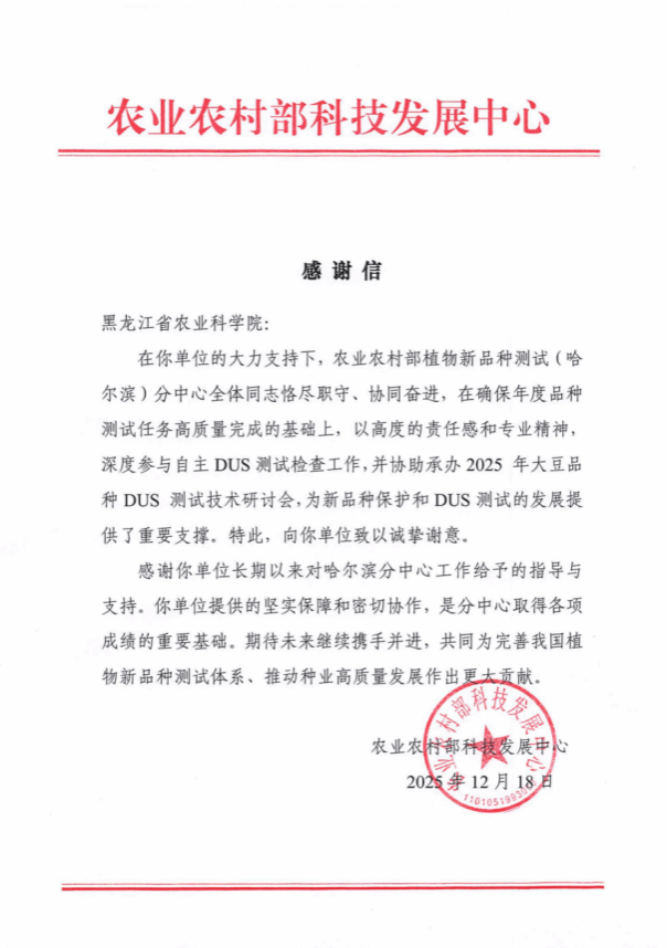 信中指出,农业农村部植物新品种测试(哈尔滨)分中心全体同志恪尽职守、协同奋进、在确保年度品种测试任务高质量完成的基础上,以高度的责任感和专业精神,深度参与自主DUS测试检查工作,并协助承办2025年大豆品种DUS测试技术研讨会。