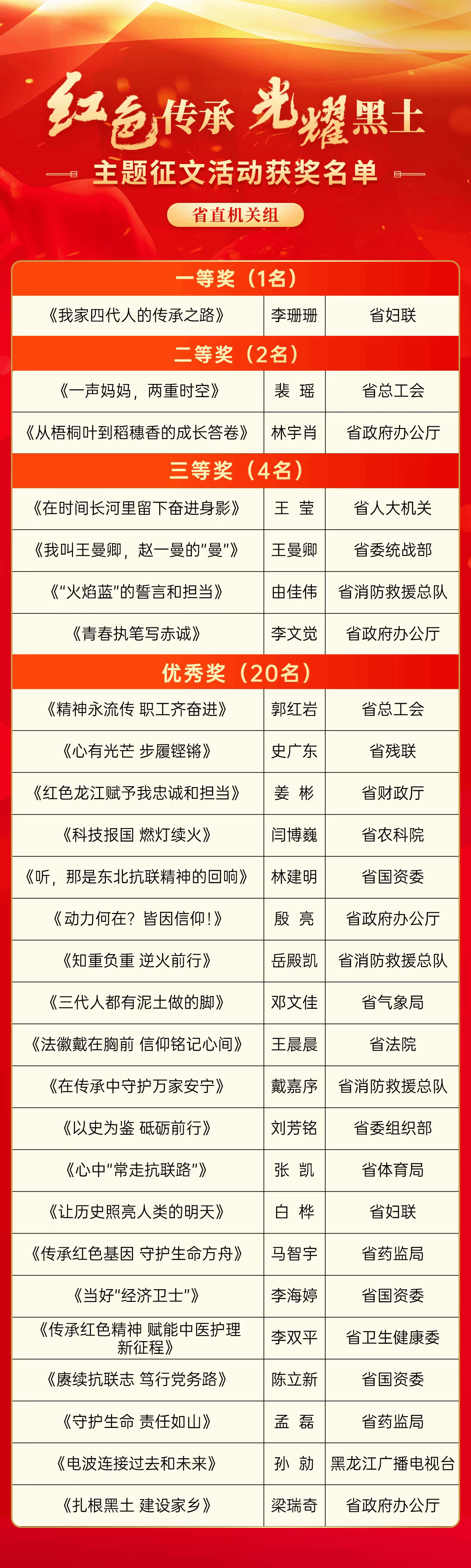 为纪念中国人民抗日战争暨世界反法西斯战争胜利80周年,由省委宣传部、省直机关工委、省教育厅联合主办,黑龙江日报报业集团承办的“红色传承·光耀黑土”主题征文评选揭晓。