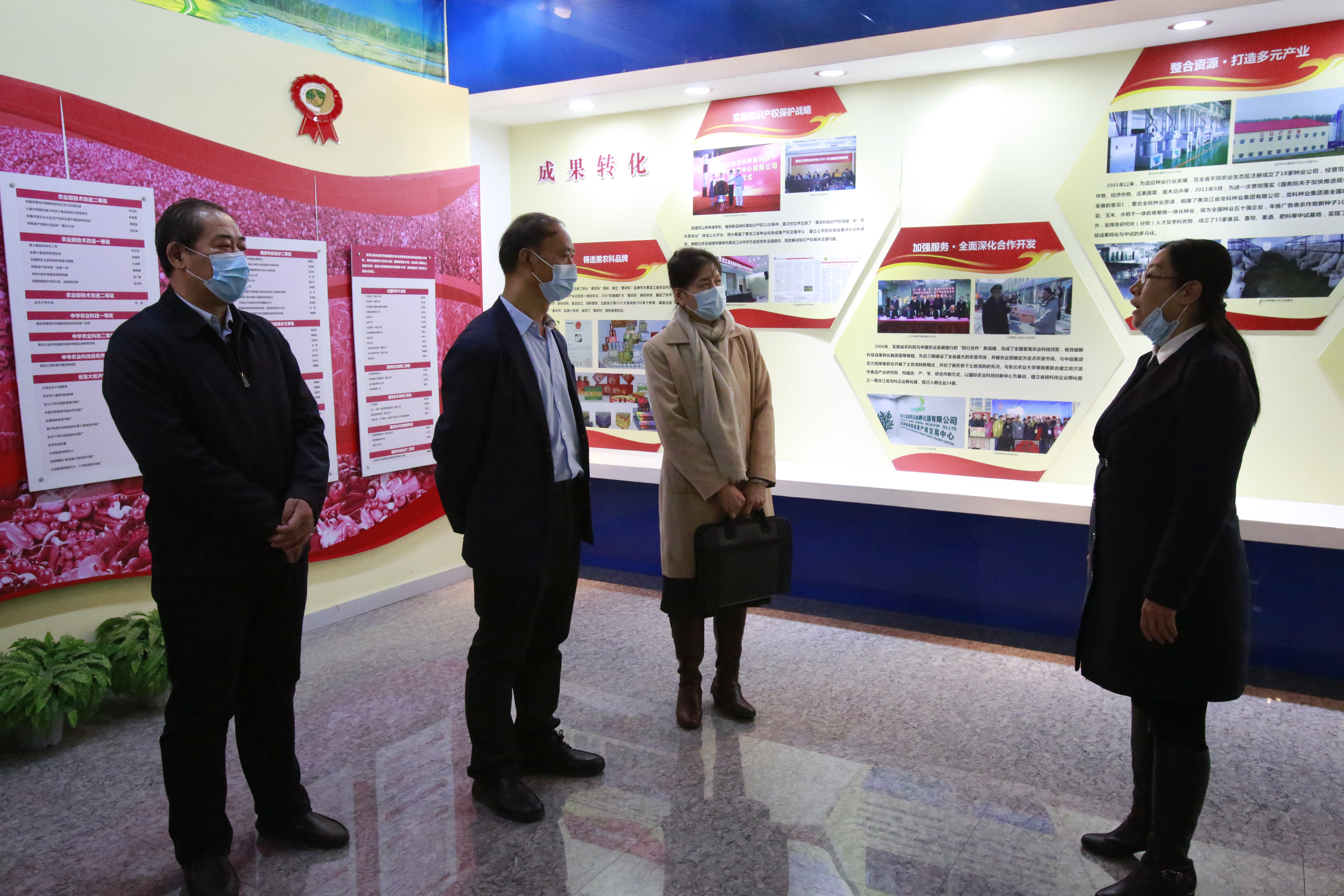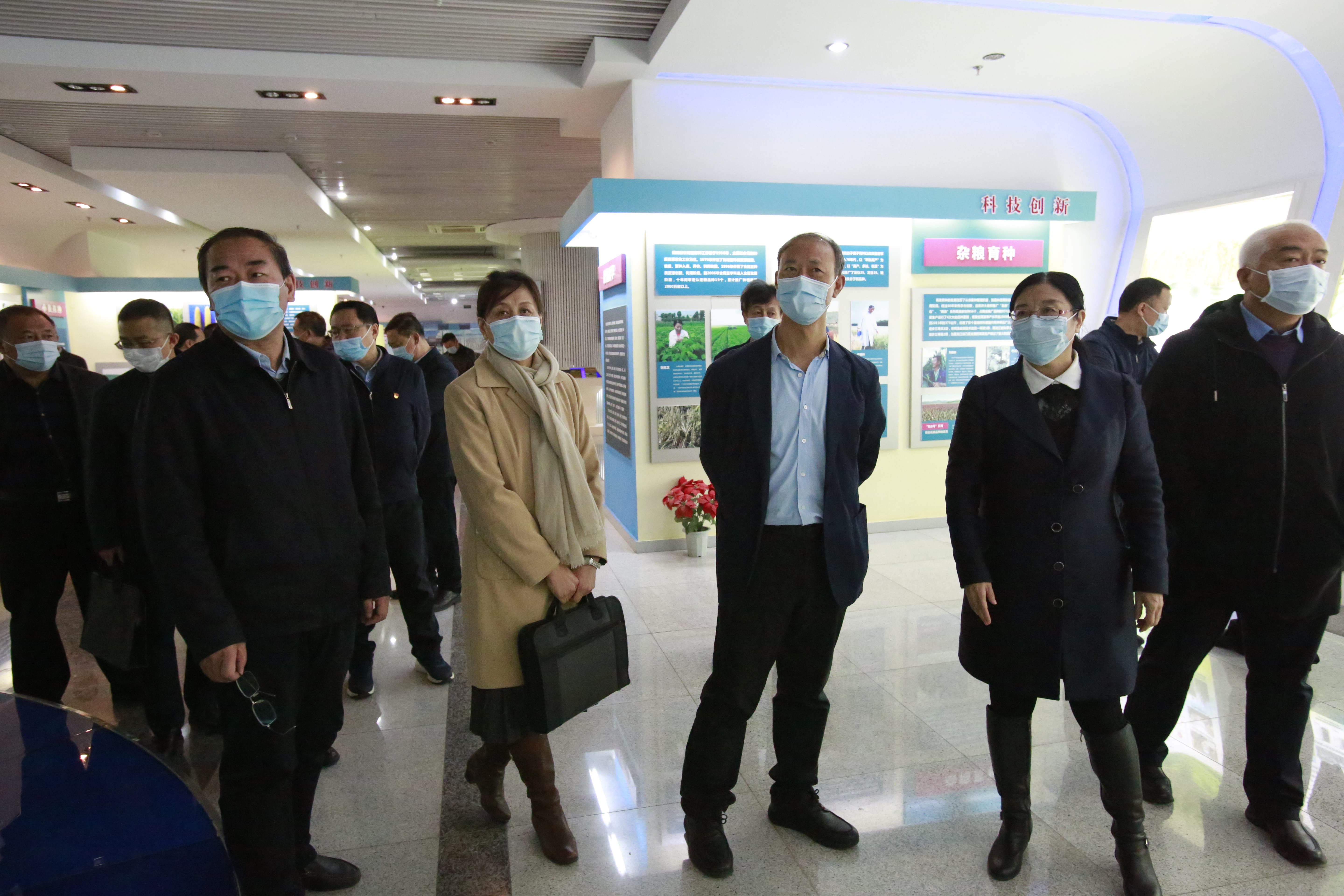 李章泽一行参观了我院农业科技展览馆。在展览馆,刘娣书记和李文华院长分别代表我院对李章泽副主任一行莅临我院调研指导工作表示欢迎,此次调研充分体现了中央对地方机构改革的高度重视和对农业科技工作者的极大关怀。并在参观过程中从我院机构设置、人才建设、平台建设、科技创新、成果转化、服务三农和技术推广等方面取得的成果进行了介绍。在大豆、水稻品种展示区,李章泽副主任对我院育成的高产、高品质、食味性好的大豆和水稻品种展现出浓厚的兴趣,对我院在农作物品种选育方面取得的成果表示肯定和赞赏。