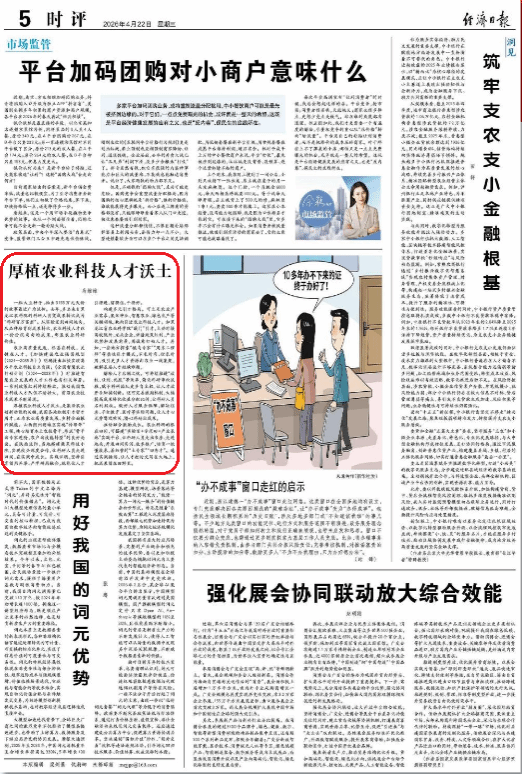 厚植农业科技人才沃土,是激活农业创新动能的关键,我国各地积极引才留才用才,正为农业高质量发展、乡村全面振兴赋能。山西朔州朔城区实施“传帮带”工程,精心培育本土农技骨干,形成“骨干向专家进阶,农户向技能转型”的良好局面。在陕西泾阳,当地搭建蔬菜科技小院,实现校企深度合作,让科研人员走进田间,在实践中成长。实践证明,坚持引育留用并举、产学研用融合,就能让人才引得进、留得住、干得好。
