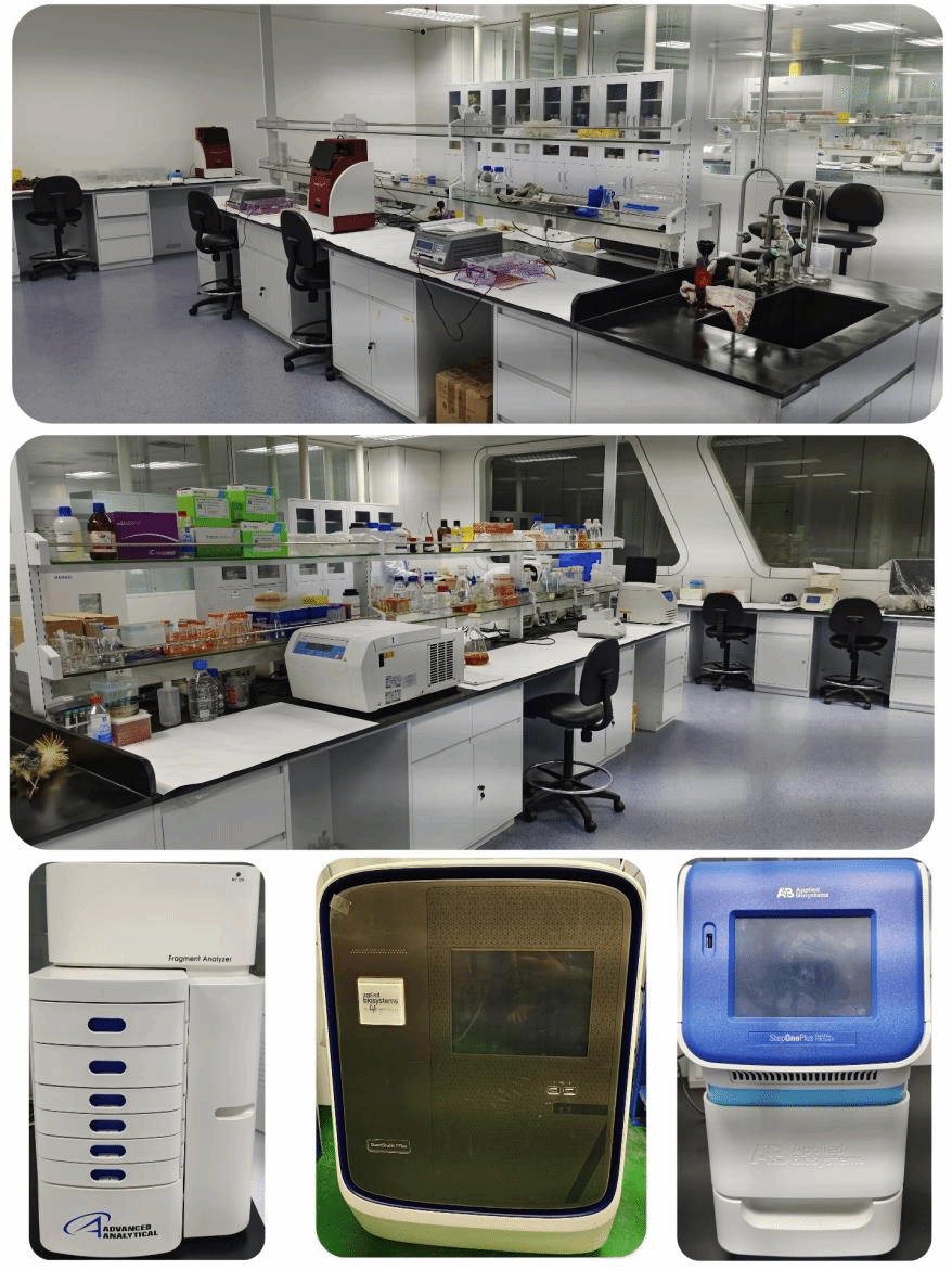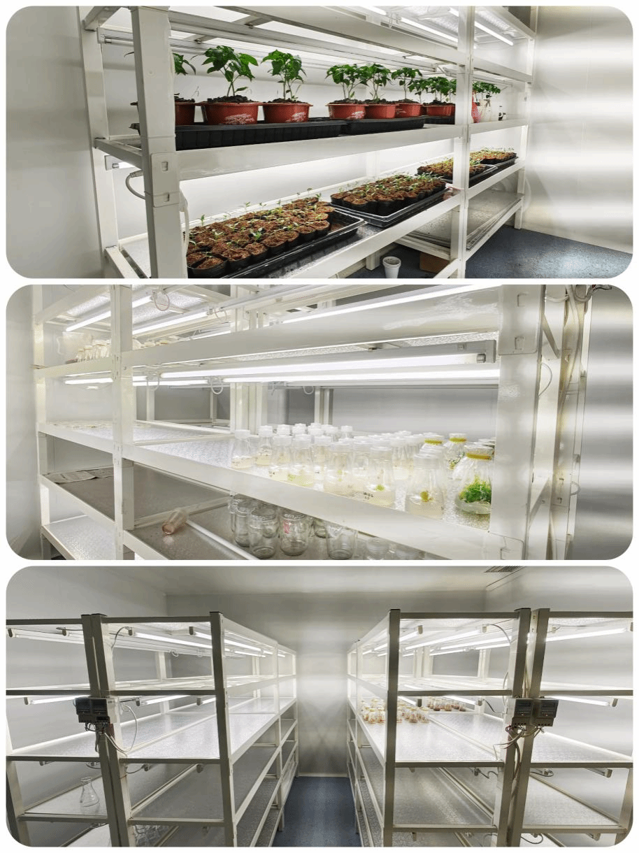 可进行植物细胞和组织的培养与分离。拥有操作室2间,组培室2间、无菌培养室1间,高压灭菌锅6台,人工气候箱3台,恒温恒湿培养箱6台,CO2培养箱1台。