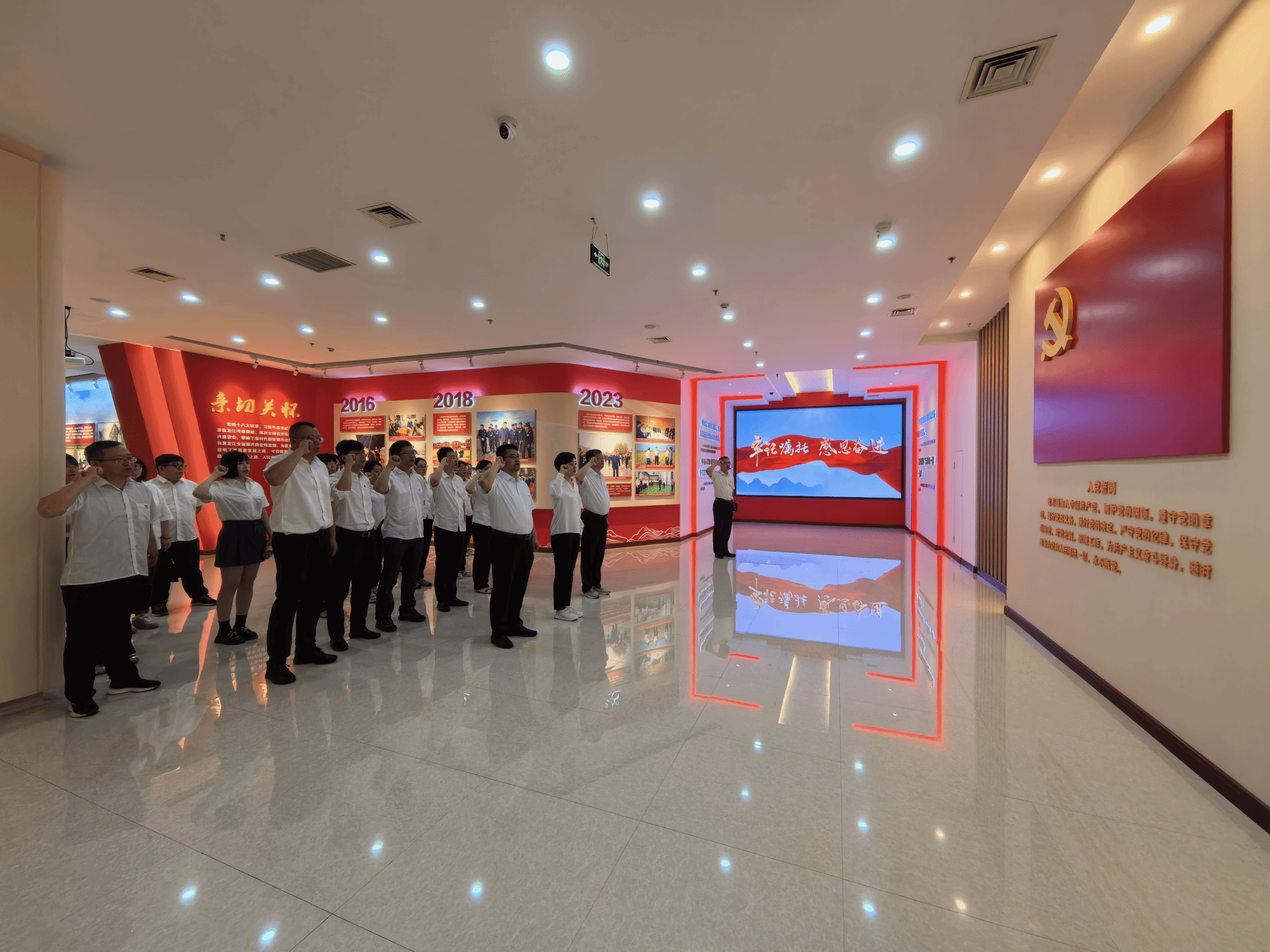 在黑龙江省廉政教育基地,全体党员、干部观看了警示教育片《永远吹冲锋号》,参观了“反腐之路”“警示教育”“示范教育”三个主题展厅,通过回顾中国共产党建党以来走过的反腐倡廉道路,重温老一辈无产阶级革命家的廉洁事迹,以及学习习近平总书记关于党风廉政建设和反腐败斗争的重要论述,大家深受启发。展馆内,一组组详实的史料、一幅幅真实的照片、一个个鲜活的案例和令人警醒的忏悔书,直观生动地展示了我党反腐倡廉工作取得的成效,以及近年来发生的党员干部违纪违法典型案例,给大家上了一堂全面生动的反腐倡廉警示教育课,带来了强烈的思想冲击和心灵震撼。参观结束后,全体党员重温了入党誓词。